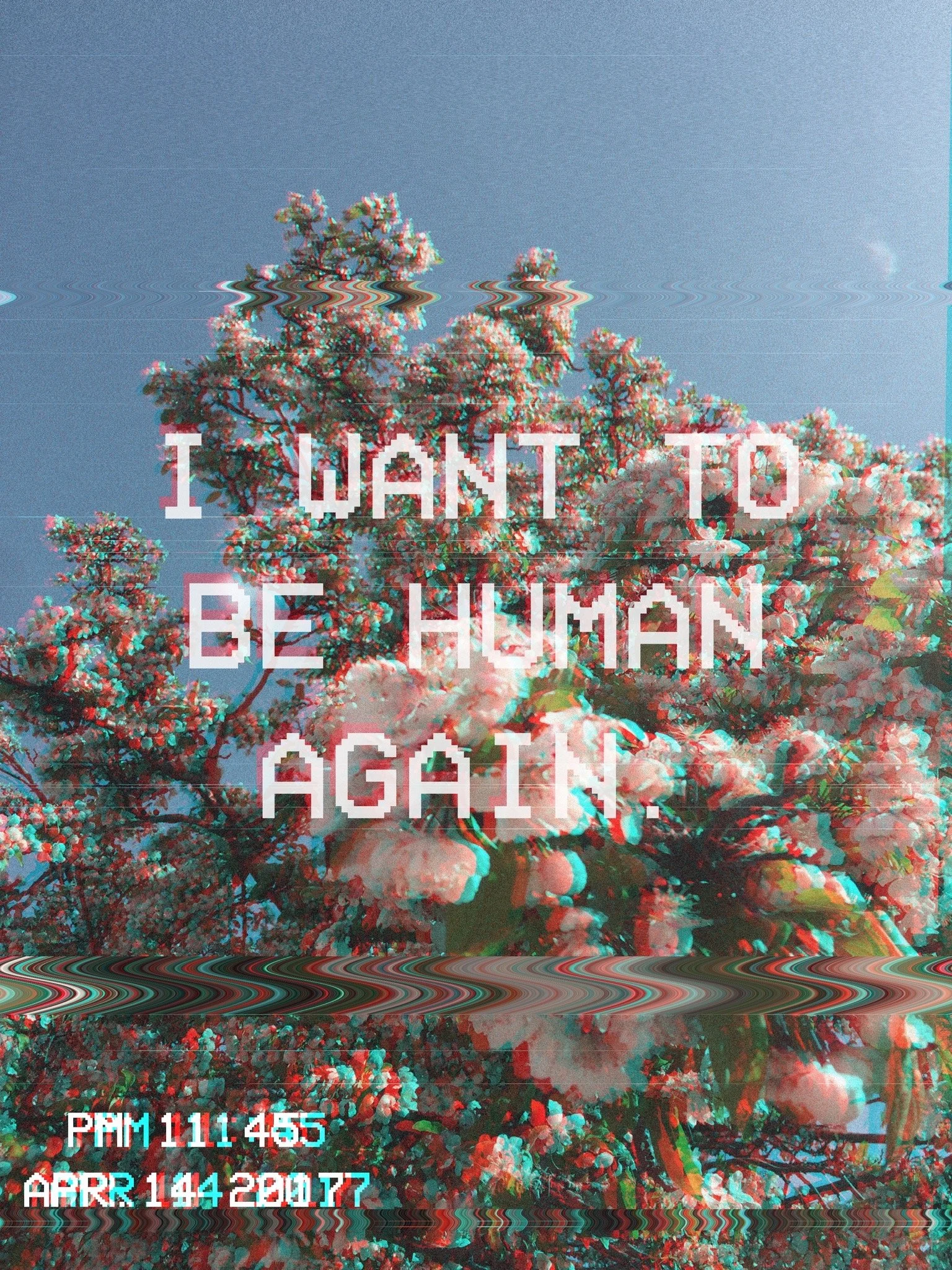 Tree with pink blossoms against a blue sky, with distorted digital visual effects and a message saying, 'I WANT TO BE HUMAN AGAIN,' overlaid in pixelated white text.