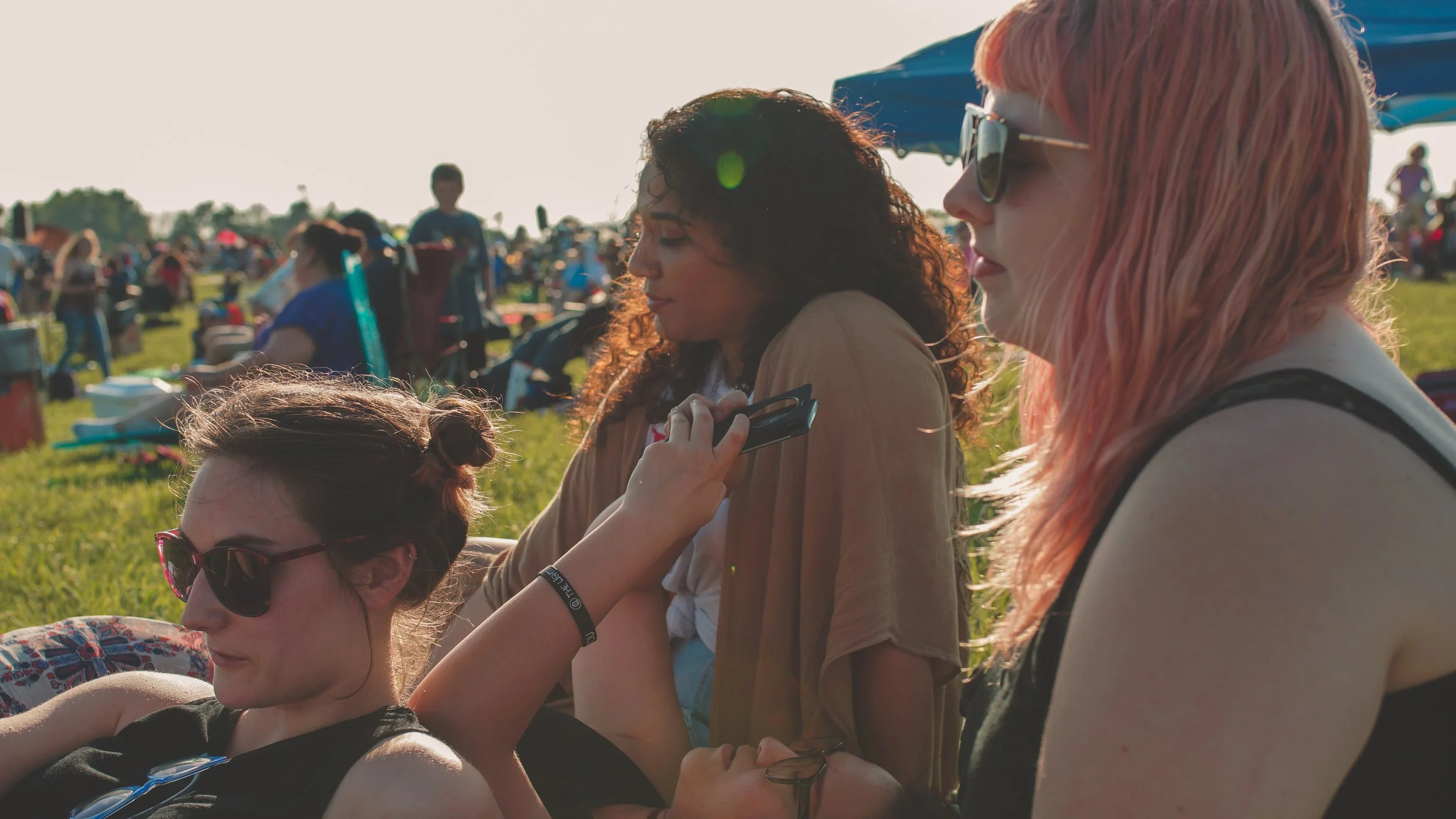 Four young women sitting outdoors at a crowded event on a sunny day, some wearing sunglasses, with people and tents in the background.