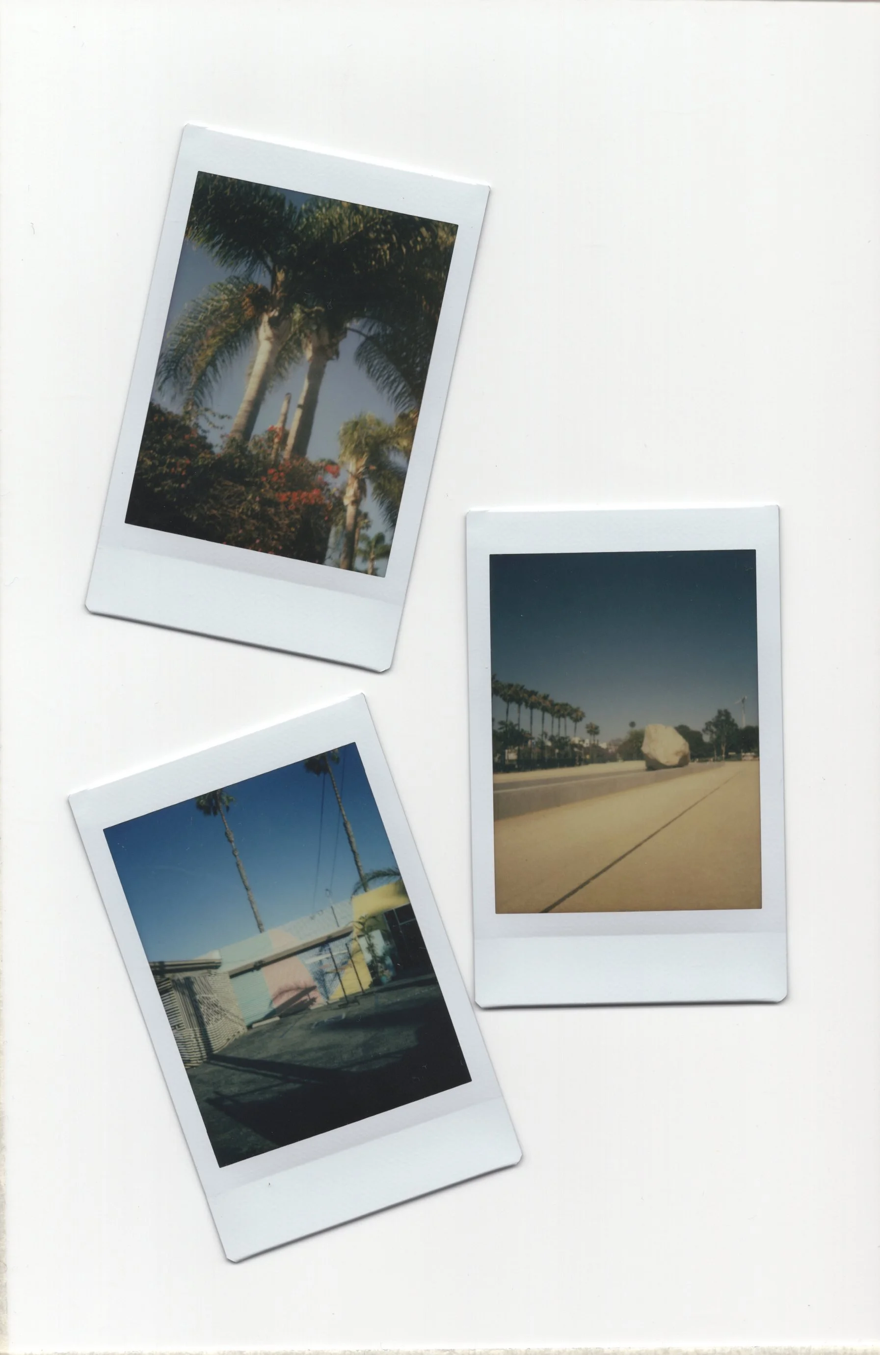 Three Polaroid photos on a white surface, featuring scenes with palm trees, a building, and a large rock on a street.