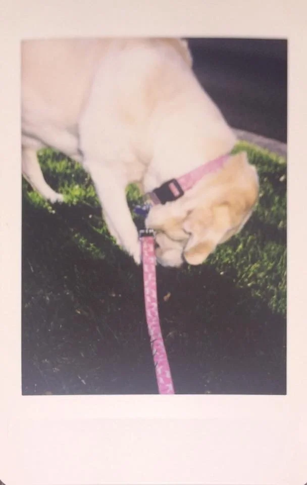 A light-colored dog, possibly a Labrador Retriever or similar breed, lying on its side on grass with its head resting near a person's leg, holding a pink leash in its mouth.